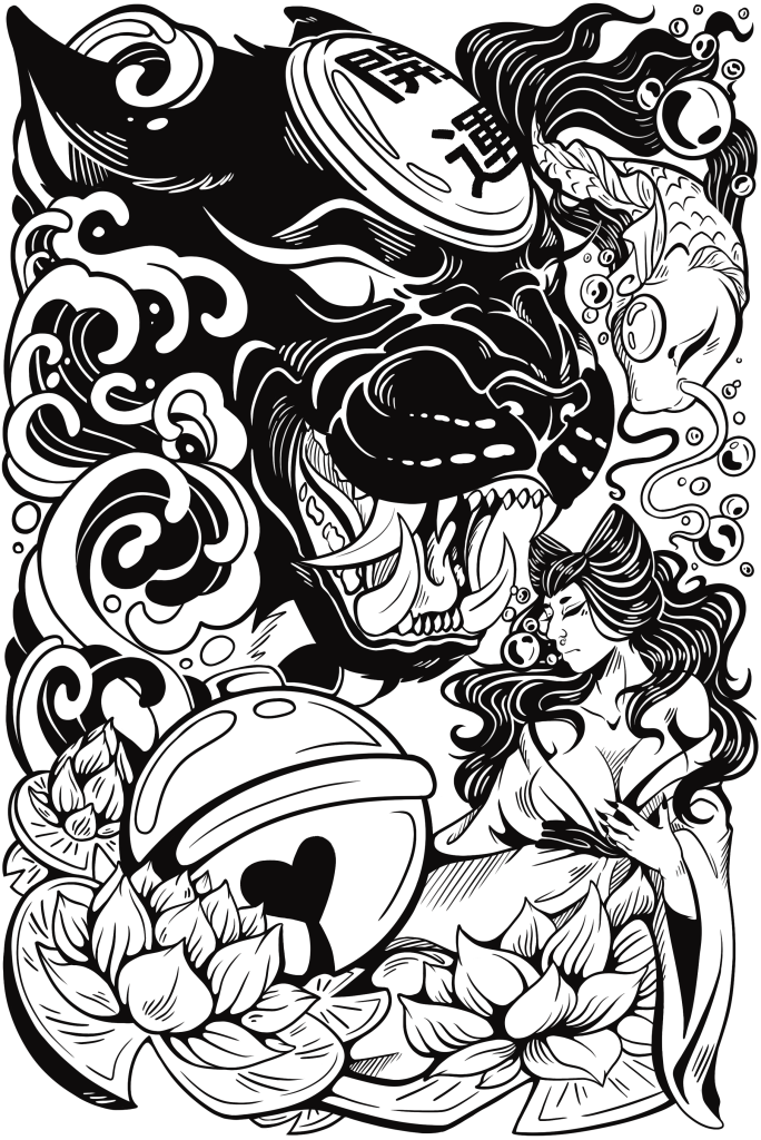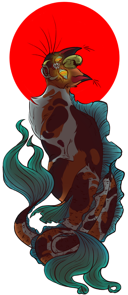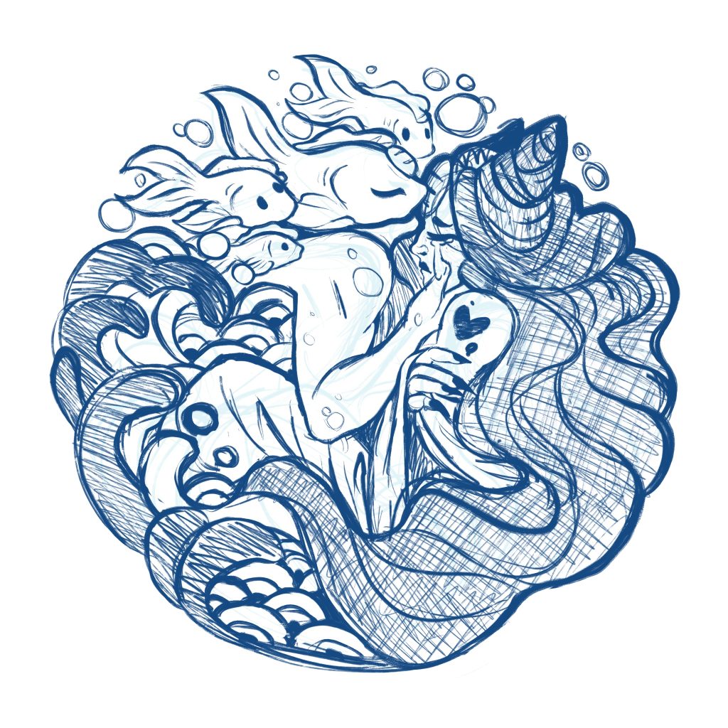 Description: This might have been for a class but I had to change a lot of this work to make it fit for the class and I wanted it to be shown in full, SO in this work you can see there is a lot of elements of my style and its basically to represent the small delicacy to being yelled at loud noises coming from the cat while the goddess just sits there calmly waiting in the water for the noises to be over while the koi fish acts as sort of a guidance to the calmness vs the cat and the harsh waves it presents.